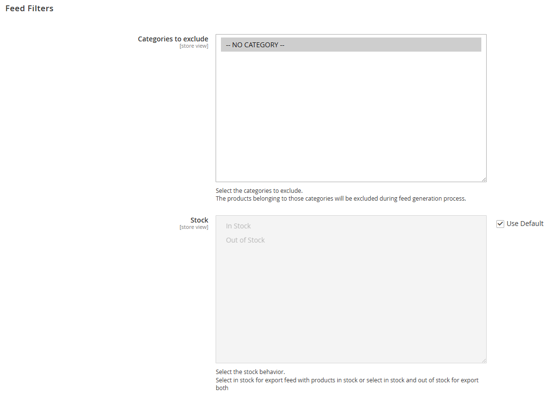 Select the stock behavior. Select in stock for export feed with products in stock or select in stock and out of stock for export both.