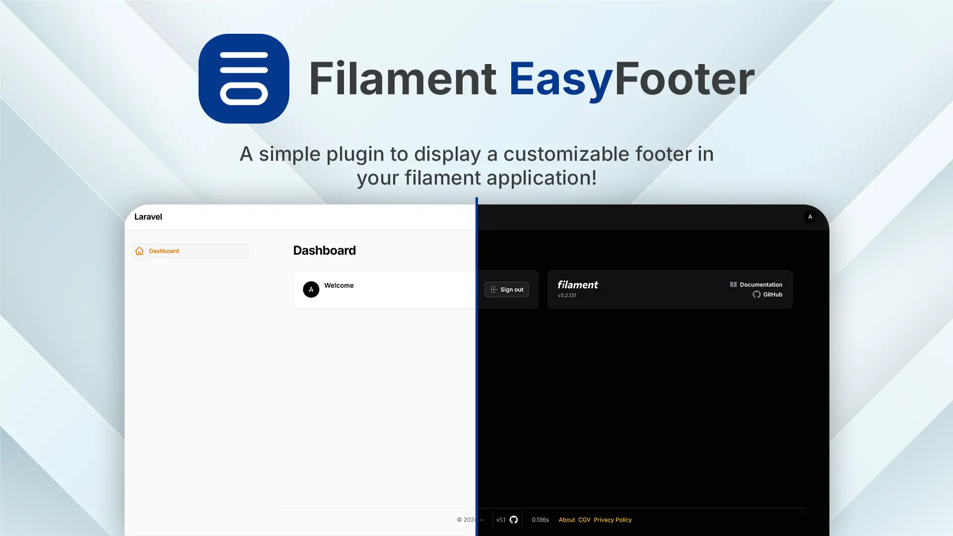 use Agelgil\FilamentEasyFooter\EasyFooterPlugin; ->plugins([ EasyFooterPlugin::make() ->withGithub(showLogo: true, showUrl: true) ])