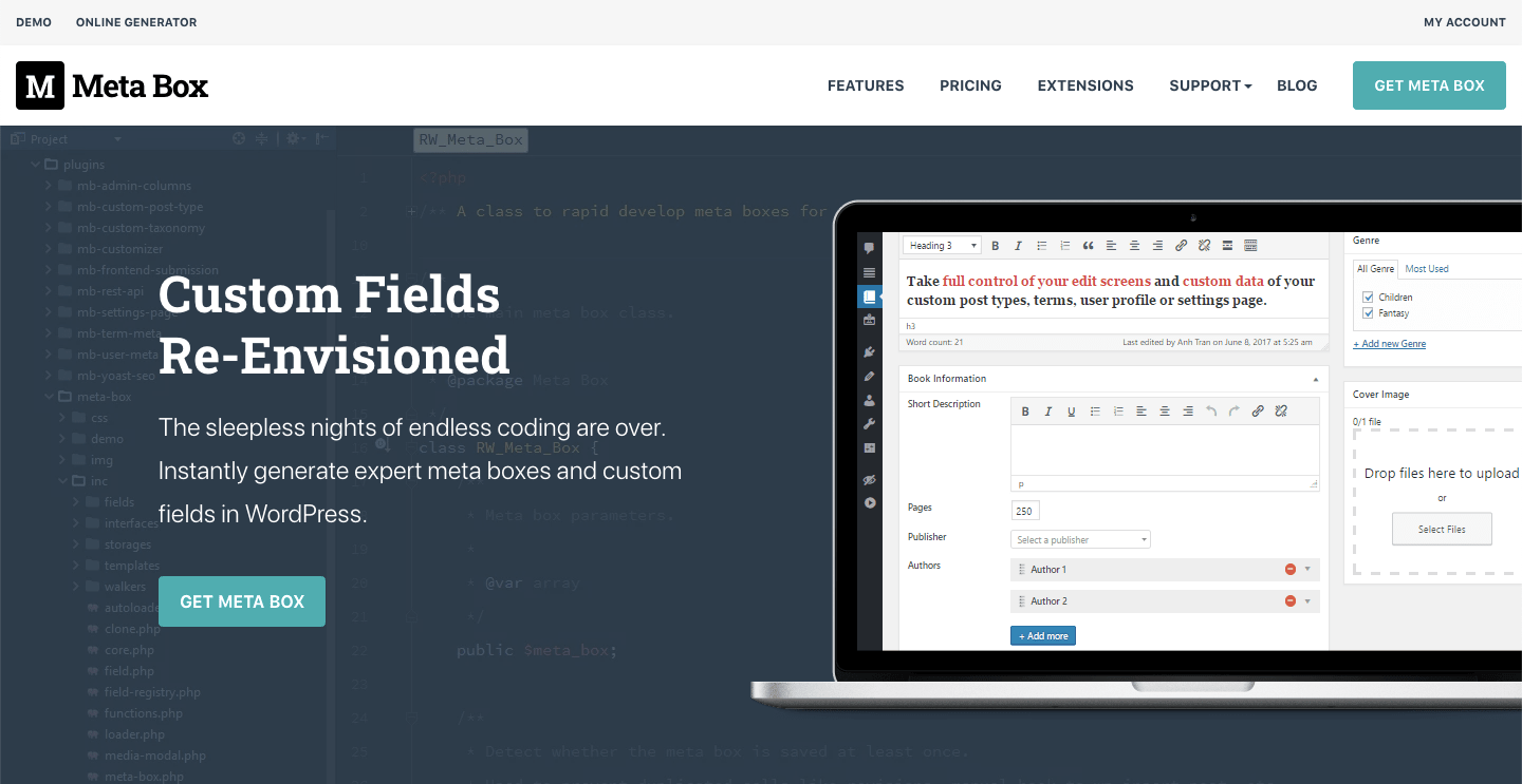 Meta Box plugin is a complete tool to create meta box and custom fields in WordPress: lightweight, powerful, easy-to-use and can be extended with extensions.