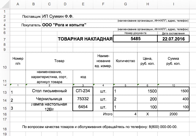 $templator = new Templator($templateFile, $outputDir, 'document.xlsx'); $settings = new Settings([ 'providerName' => 'ИП Сумкин Ф.Ф.', 'clientName' => 'ООО "Рога и копыта"', 'docNumber' => 5485, 'docDate' => date('d.m.Y'), 'totalProductAmount' => 4, 'totalProductSum' => 2000, ]); $loopData = new LoopData(); $loopData->setMap([ 'productName', 'productArticle', 'productUnit', 'productAmount', 'productPrice', 'productSum', ]); $loopData->setSource([ ['Стол письменный', 'СП-234', 'шт.', 1, 1500, 1500], ['Чернильница', '75332', 'шт.', 2, 200, 400], ['Лампа настольная 12Вт', '6454', 'шт.', 1, 100, 100], ]); $settings->addLoop(1, $loopData); $templator->render($settings); $templator->save();
