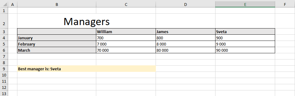 $data = [ 'best_manager' => 'Sveta', // two-dimensional table 'managers' => [ 'titles' => [[ 'William', 'James', 'Sveta' ]], 'values' => [ [ // additional row 'month' => 'January', 'amount' => [700, 800, 900], // additional columns ], [ 'month' => 'February', 'amount' => [7000, 8000, 9000], ], [ 'month' => 'March', 'amount' => [70000, 80000, 90000], ], ], ], ]; // Save as XLSX (Excel) (new \AnourValar\Office\SheetsService()) ->generate('template2.xlsx', $data) ->saveAs('generated_document.xlsx'); // second argument (format) is optional