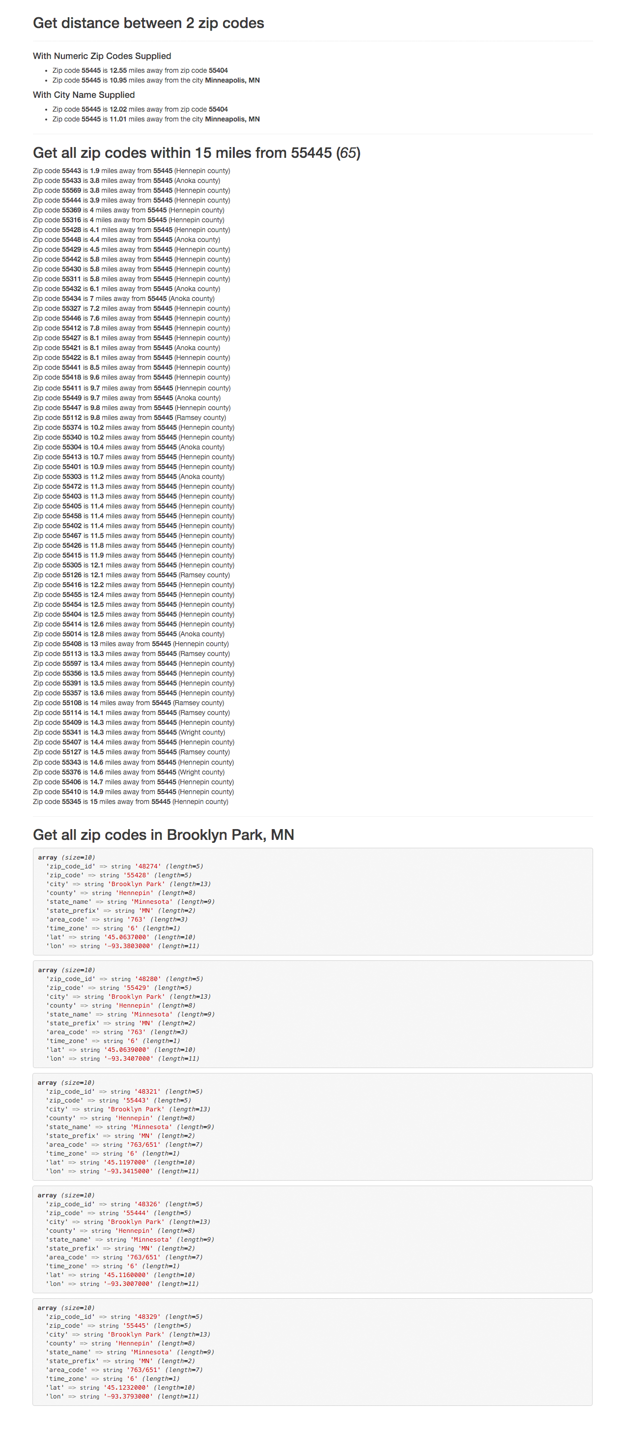 Zip-Calc was created to convert a PHP class written by Quixotix in 2005 from MySQL to PostgreSQL. This class calculates the distance between U.S. zip codes and also finds all of the zip codes within a 9 given radius of a known zip code.