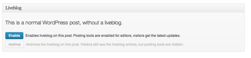 Once the event has wrapped up, you can archive your liveblog. This means that visitors will still be able to see the blog, but the editing tools will go away and the post will stop polling for updates. You can archive and re-enable a liveblog from the Edit Post page.