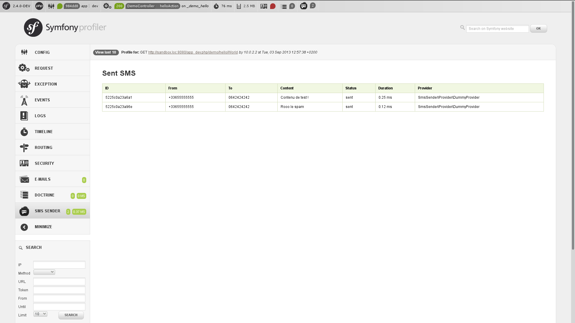 This bundle also integrates SmsSender in Symfony's Web Profiler.