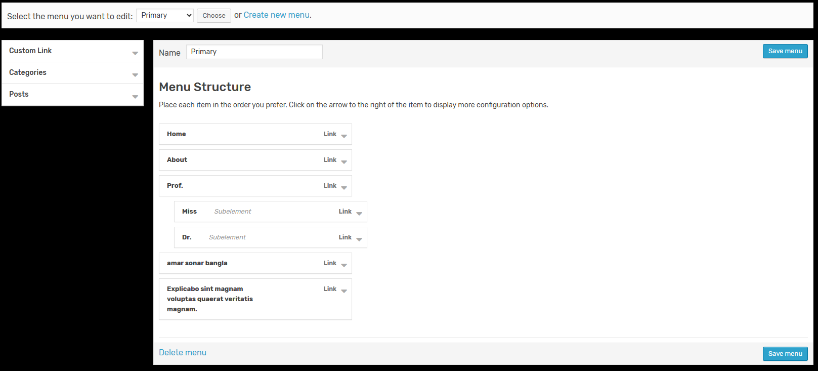 In this example, you must have a menu named Admin
