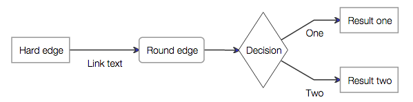 use Bound1ess\MermaidPhp\Graph, Bound1ess\MermaidPhp\Printer, Bound1ess\MermaidPhp\Node, Bound1ess\MermaidPhp\Link; $graph = new Graph('from left to right'); $graph->addNodes( $a = new Node('A', ['Hard edge']), $b = new Node('B', ['Round edge', Node::ROUND_EDGE]), $c = new Node('C', ['Decision', Node::RHOMBUS]), $d = new Node('D', ['Result one']), $e = new Node('E', ['Result two']) ); $graph->addLinks( new Link($a, $b, 'Link text'), new Link($b, $c), new Link($c, $d, 'One'), new Link($c, $e, 'Two') ); $code = (new Printer)->printGraph($graph);
