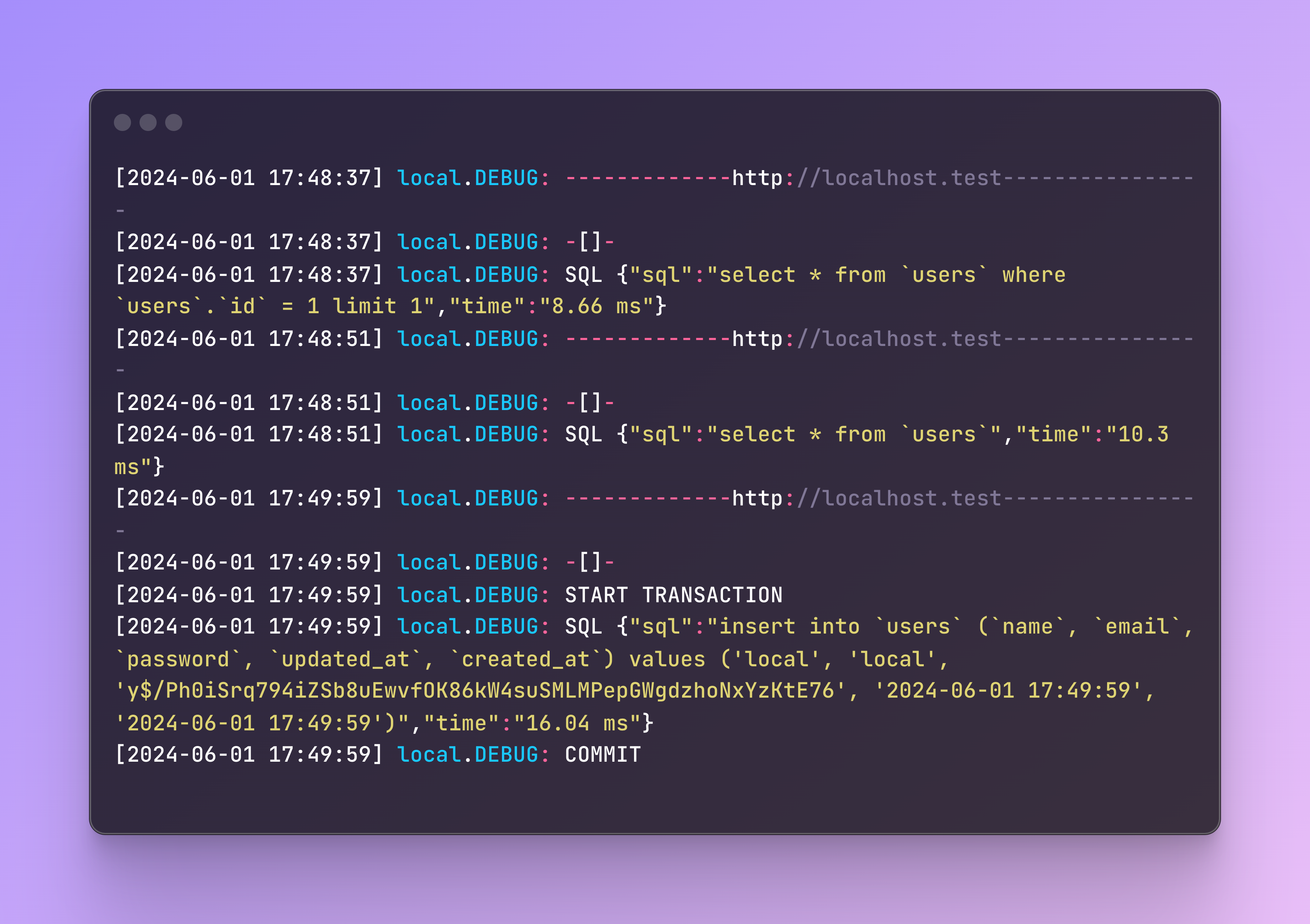 // bootstrap/providers.php return [ ... Bri4n0\SqlQueryLog\DataBaseQueryServiceProvider::class, ];