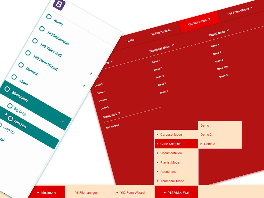 A Yii2 widget that creates a navigation menu based on the yii\widgets\Menu, and provides you with multiple layout options Big Drop, Left Menu and a Sticky drop-up footer menu .