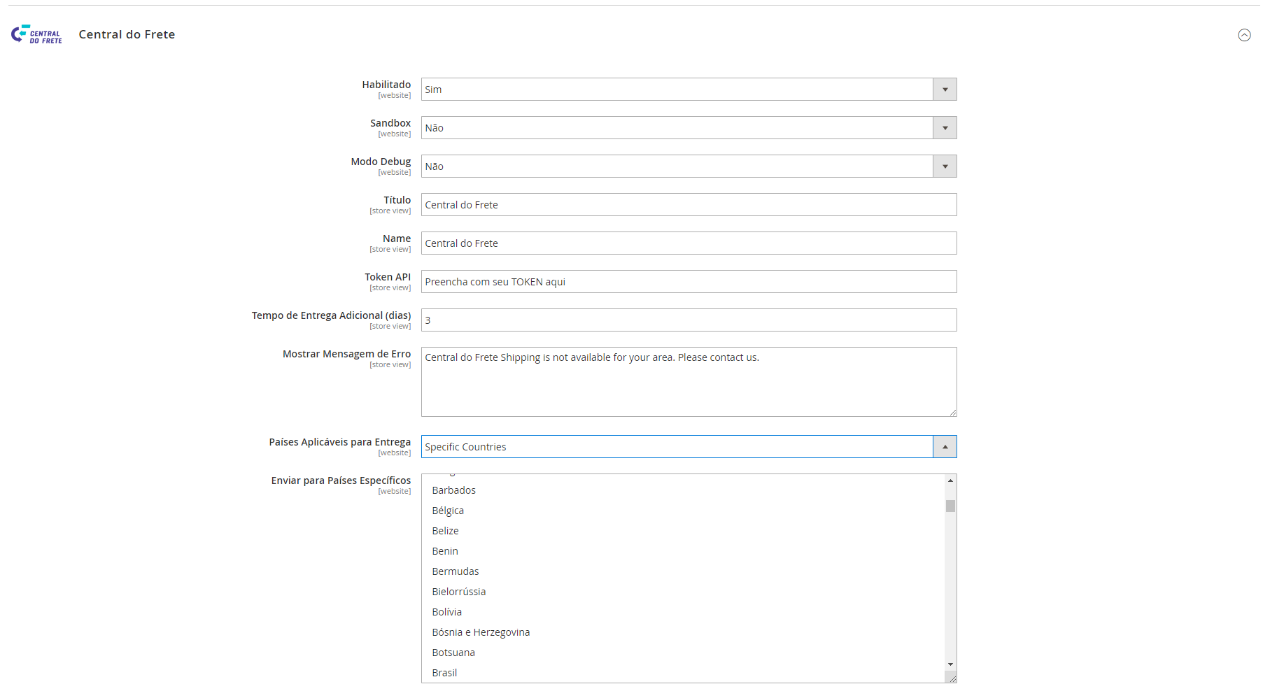 Acesse Stores > Configuration > Sales > Shipping Methods > Central do Frete.