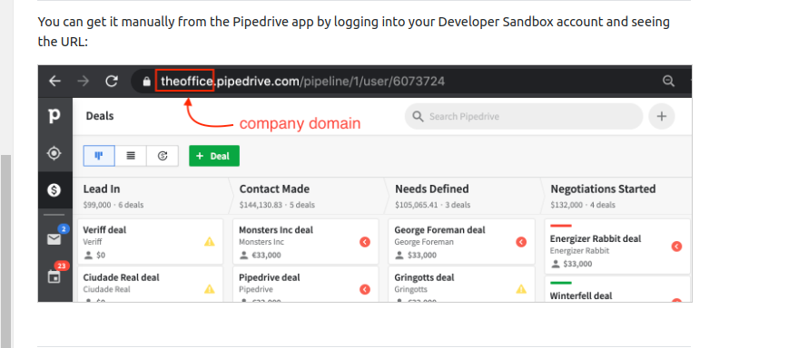 - PIPEDRIVE_ENDPOINT comprises you company domain and /api/v1.