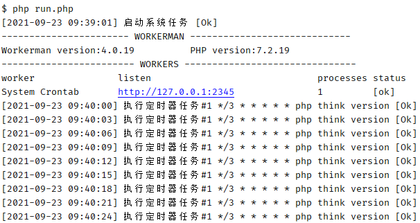$ php think crontab -h Usage: crontab [options] [--] <action> Arguments: action start|stop|restart|reload|status|connections Options: -d, --daemon Run the http crontab server in daemon mode. --name[=NAME] Crontab name [default: "Crontab Server"] --debug Print log -h, --help Display this help message -V, --version Display this console version -q, --quiet Do not output any message --ansi Force ANSI output --no-ansi Disable ANSI output -n, --no-interaction Do not ask any interactive question -v|vv|vvv, --verbose Increase the verbosity of messages: 1 for normal output, 2 for more verbose output and 3 for debug