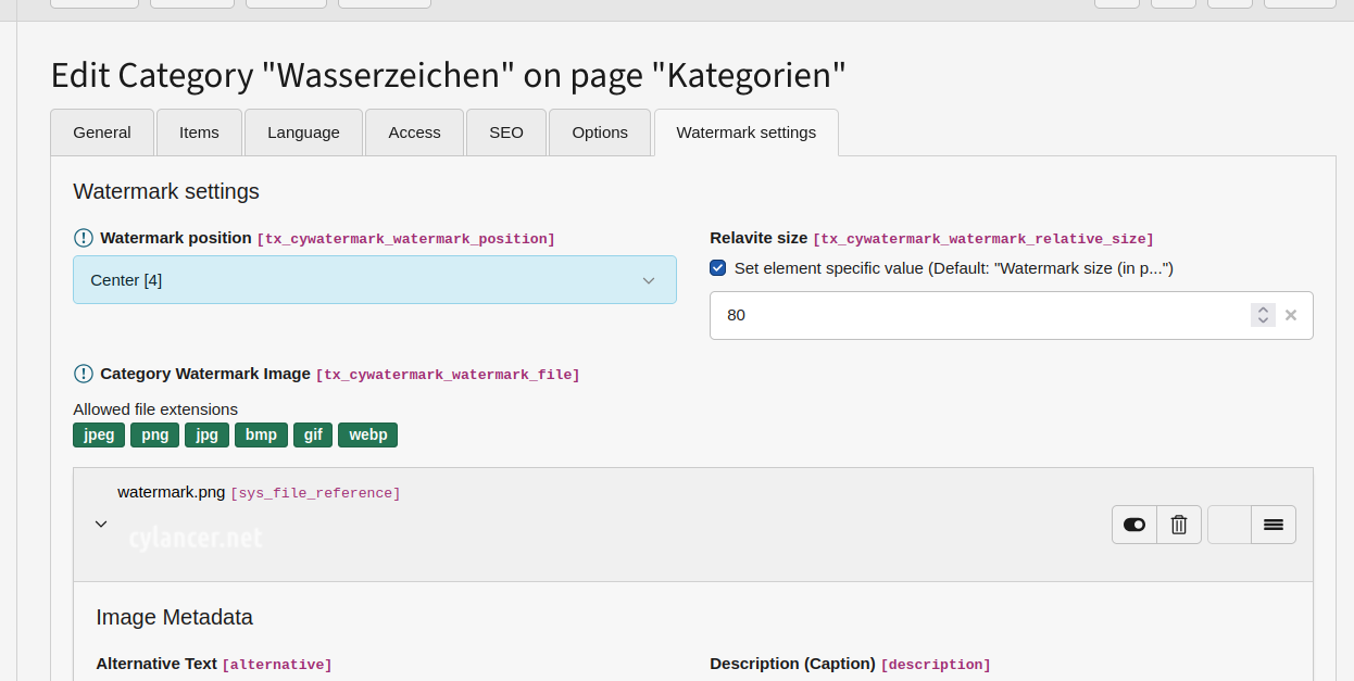 - 0.9.0 UPD Add a clean mechanismus. Cached images with watermark is deleted if the a category or files meta data is changed.