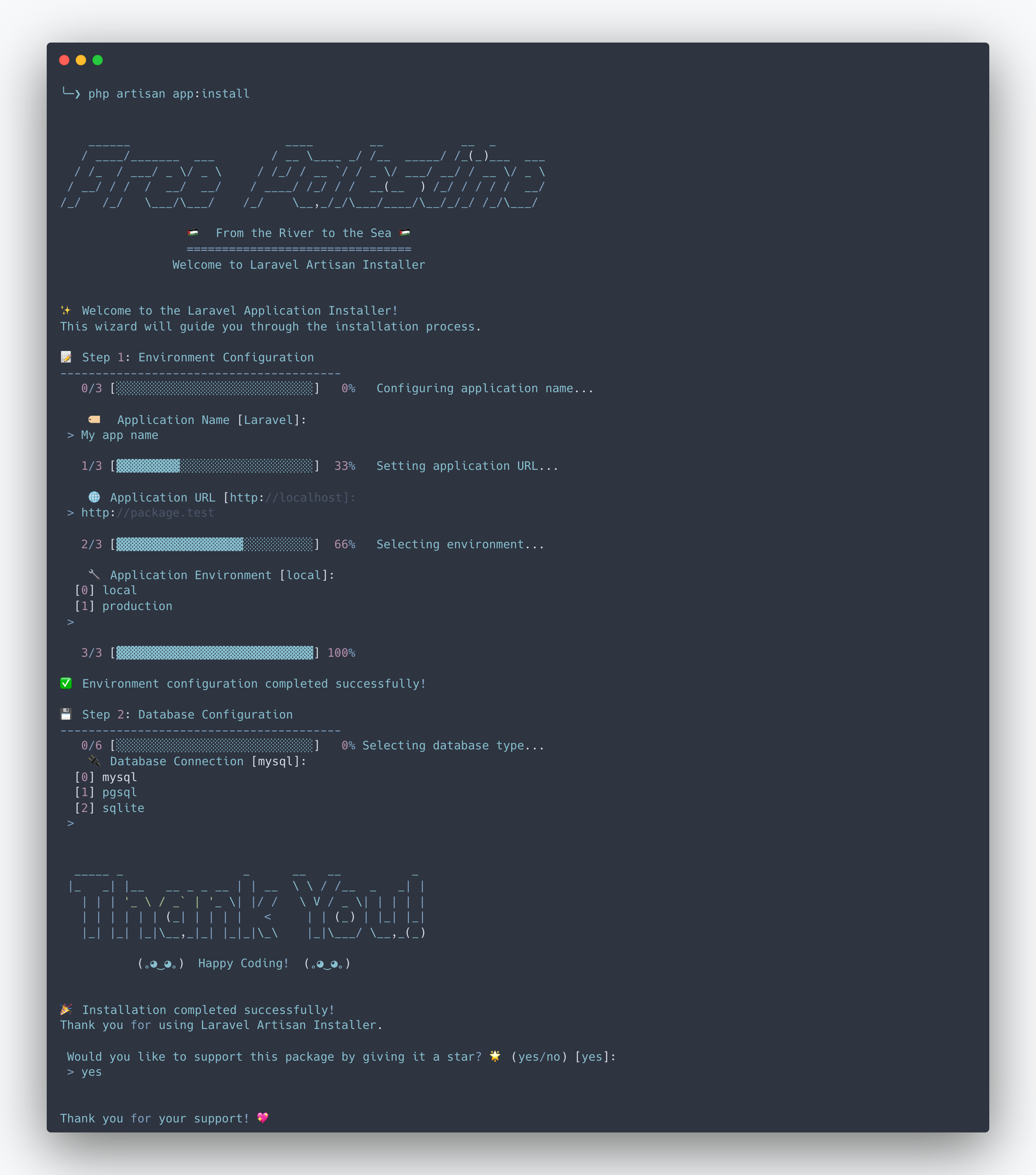 A Laravel package that provides an interactive command-line installer for easy application setup. This package helps streamline the initial configuration process of Laravel applications through an intuitive artisan command. ✨