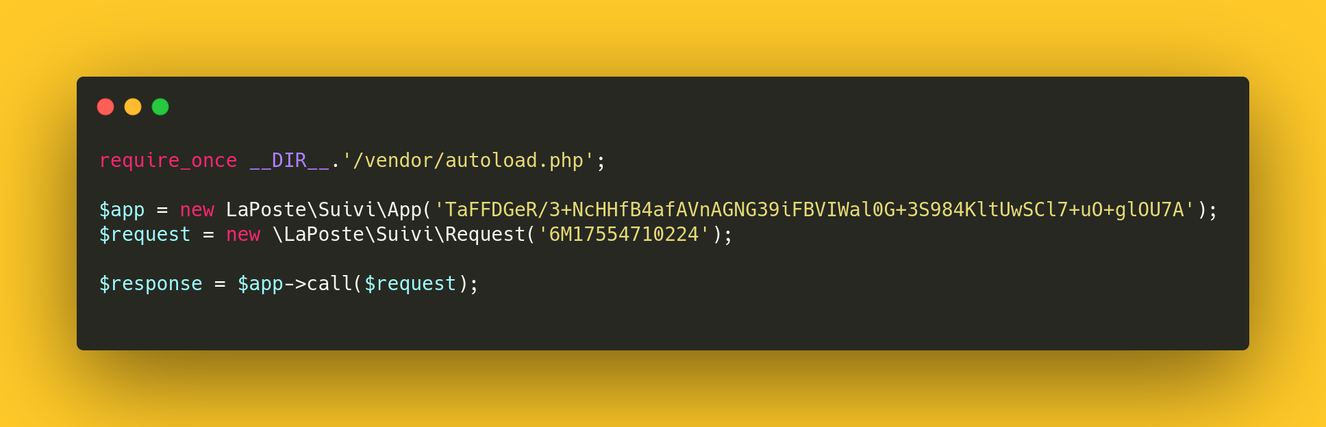 require_once __DIR__.'/vendor/autoload.php'; $app = new LaPoste\Suivi\App('YOUR_X-OKAPI-KEY_HERE'); $request = new \LaPoste\Suivi\Request('6M17554710224'); $response = $app->call($request);