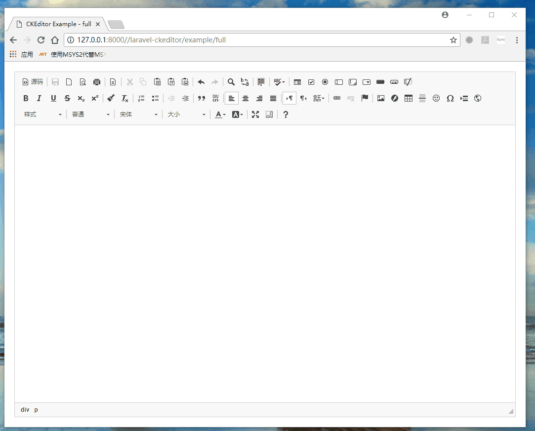 <!DOCTYPE html> <html lang="en"> <head> <meta charset="UTF-8"> <title>CKEditor Example</title> {!! ckeditor_js() !!} {!! ckeditor_css() !!} </head> <body> <textarea id="editor1" cols="10" rows="10"> <p>This is some sample text. You are using <a href="http://ckeditor.com">CKEditor</a>, an online <abbr title="What You See Is What You Get">WYSIWYG</abbr>&nbsp;editor.</p> </textarea> @section('ckeditorExtraScript') // 可以继续追加额外的 CKEditor 代码,具体请参考官方文档 https://sdk.ckeditor.com/ 或 https://docs.ckeditor.com/ckeditor4/docs/ language: 'zh-TW', uiColor: '#9AB8F3', filebrowserImageUploadUrl : '/laravel-ckeditor/upload?_token={!! csrf_token() !!}&type=images&by=btn_up', // filebrowserUploadUrl : '/laravel-ckeditor/upload?_token={!! csrf_token() !!}&by=btn_up', imageUploadUrl : '/laravel-ckeditor/upload?_token={!! csrf_token() !!}&type=images&by=drop_or_clipboard_up', // only for image // uploadUrl : '/laravel-ckeditor/upload?_token={!! csrf_token() !!}&by=drop_or_clipboard_up', @overwrite @include('ckeditor::parts.full', ['editorId' => 'editor1']) </body> </html>