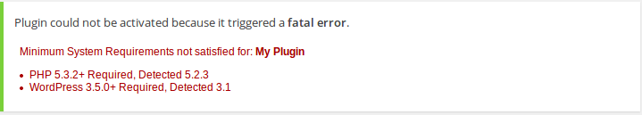 <?php $requirements = new WP_Min_Requirements(); if ($requirements->satisified()) { // create your plugin here } else { $fauxPlugin = new WP_Faux_Plugin('My Plugin Name', $requirements->getResults()); $fauxPlugin->enable(__FILE__); }