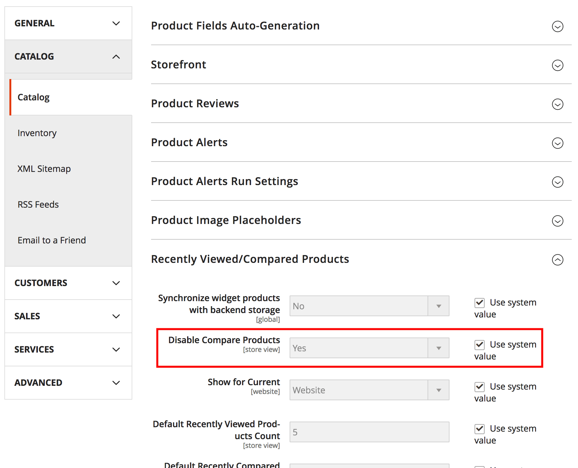 php bin/magento config:set catalog/recently_products/disable_compare 1