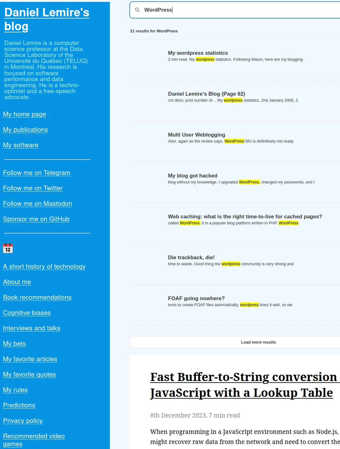 The entire WordPress blog including comments has been migrated to a static site as of 08-Dec-2023. The new site has comments, a commenting system using HashOver, and instant search via Pagefind using WebAssembly.
