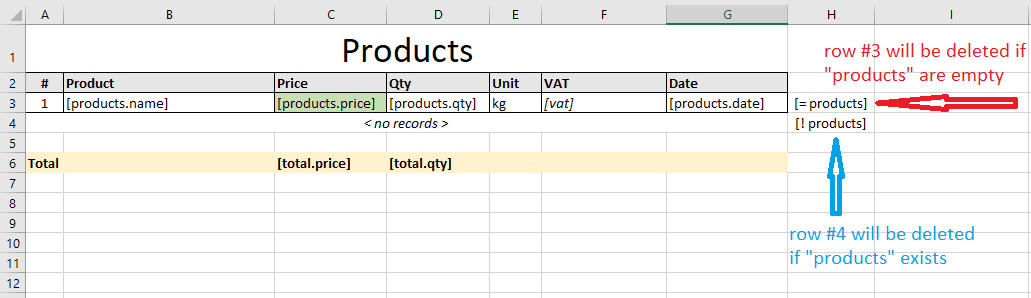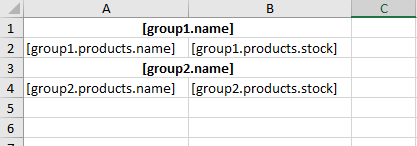 $data = [ 'group1' => [ 'name' => 'Group 1', 'products' => [ ['name' => 'Product 1', 'stock' => 101], ['name' => 'Product 2', 'stock' => 102], ], ], 'group2' => [ 'name' => 'Group 2', 'products' => [ ['name' => 'Product 3', 'stock' => 103], ['name' => 'Product 4', 'stock' => 104], ], ], ]; (new \EmizorIpx\OfficePhp74\SheetsService()) ->hookLoad(function ($driver, string $templateFile, $templateFormat) { // create empty document instead of using existing return $driver->create(); }) ->hookBefore(function ($driver, array &$data) { // place markers on-fly $row = 1; foreach (array_keys($data) as $group) { // group's title $driver ->setValue("A$row", "[{$group}.name]") ->mergeCells("A$row:B$row") ->setStyle("A$row", ['align' => 'center', 'bold' => true]); $row++; // group's products $driver ->setValue("A$row", "[$group.products.name]") ->setValue("B$row", "[$group.products.stock]"); $row++; } }) ->generate('', $data) ->saveAs('generated_document.xlsx');
