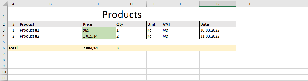 $data = [ // scalar 'vat' => 'No', 'total' => [ 'price' => 2004.14, 'qty' => 3, ], // one-dimensional table 'products' => [ [ 'name' => 'Product #1', 'price' => 989, 'qty' => 1, 'date' => new \DateTime('2022-03-30'), ], [ 'name' => 'Product #2', 'price' => 1015.14, 'qty' => 2, 'date' => new \DateTime('2022-03-31'), ], ], ]; // Save as XLSX (Excel) (new \EmizorIpx\OfficePhp74\SheetsService()) ->generate( 'template1.xlsx', // path to template $data // input data ) ->saveAs( 'generated_document.xlsx', // path to save \EmizorIpx\OfficePhp74\Format::Xlsx // save format ); // Available formats: // \EmizorIpx\OfficePhp74\Format::Xlsx // \EmizorIpx\OfficePhp74\Format::Pdf // \EmizorIpx\OfficePhp74\Format::Html // \EmizorIpx\OfficePhp74\Format::Ods