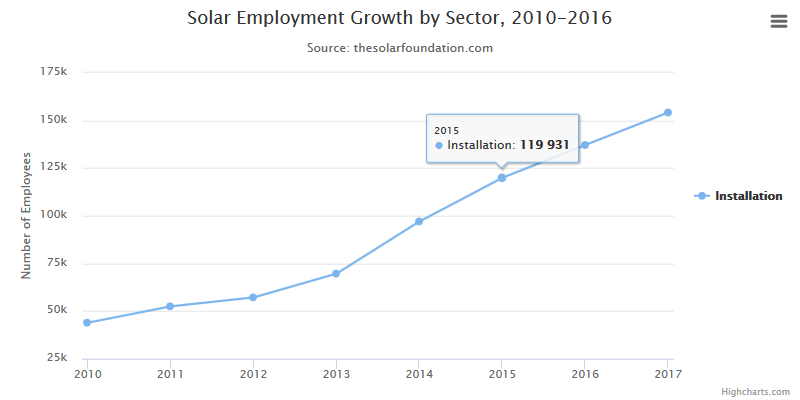 $chart = app('chart'); $chart->pushSubset('title', function($title){ $title->pushCriteria(new Criterias\Text('Solar Employment Growth by Sector, 2010-2016')); }); $chart->pushSubset('subtitle', function($subtitle){ $subtitle->pushCriteria(new Criterias\Text('Source: thesolarfoundation.com')); }); $chart->pushSubset('yAxis.title', function($title){ $title->pushCriteria(new Criterias\Text('Number of Employees')); }); $chart->pushSubset('legend', function($legend){ $legend->pushCriteria(new Criterias\Layout('vertical')); $legend->pushCriteria(new Criterias\Align('right')); $legend->pushCriteria(new Criterias\VerticalAlign('middle')); }); $chart->pushSubset('plotOptions.series', function($plotOptions){ $plotOptions->pushCriteria(new Criterias\PointStart(2010)); }); $chart->pushSubset('series', function($series){ $series->pushCriteria(new Criterias\Name('Installation')); $series->pushCriteria(new Criterias\Data([43934, 52503, 57177, 69658, 97031, 119931, 137133, 154175])); }); $chartSolarEmployment = $chart->render();