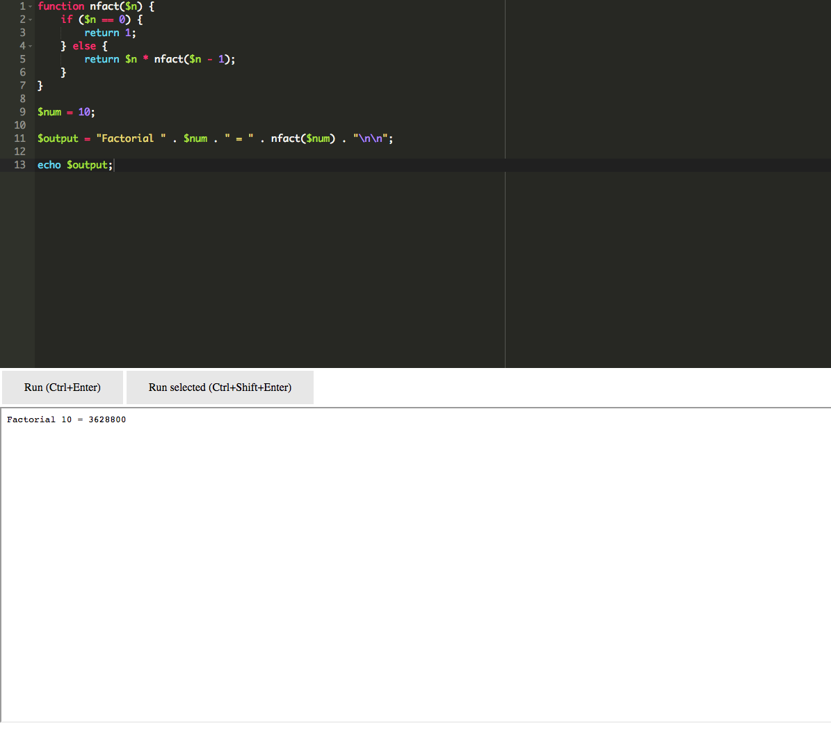 You should see editor window with php code highlighting (powered by Ace Editor) and the result window. Now you can type/copy any code or even whole classes and test them in your browser and everything will work as if it has been typed in tinker console command.