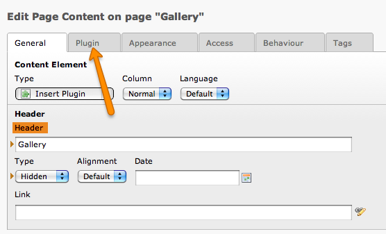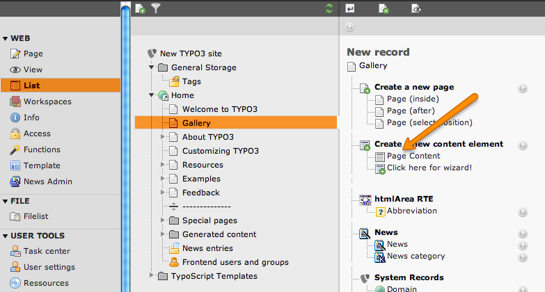 To install a gallery on a page, click on the page where the gallery should be displayed and create a new content element.