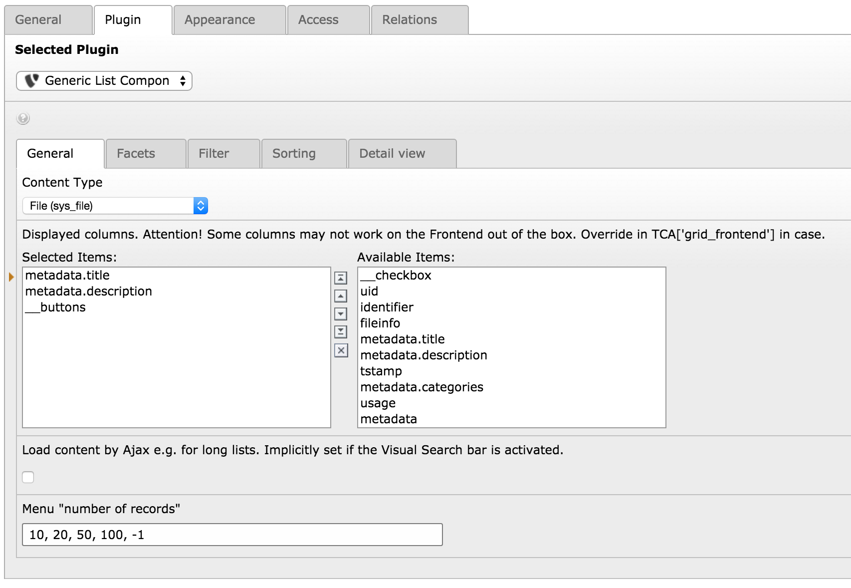 Once installed, it can be configured what content type to render associated with a customizable template in the plugin record in the Backend. On the Frontend side, we use the excellent DataTables which is a powerful jQuery plugin smart and fast to sort and filter data. The Filter bar is provided by the Visual Search jQuery plugin which offers nice facet capabilities and intuitive search.