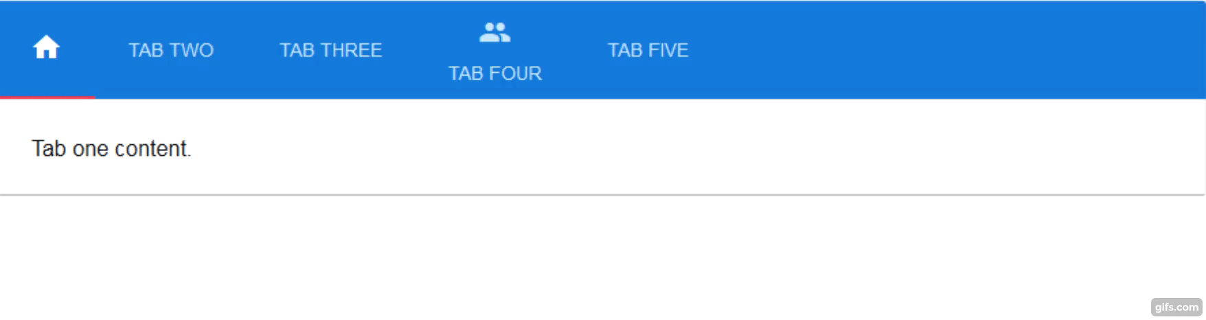 use faboslav\materialtabs\MaterialTabs echo MaterialTabs::widget([ 'items' => [ [ 'label' => '<i class="material-icons">home</i>', 'content' => 'Tab one content.' ], [ 'label' => 'Tab two', 'content' => 'Tab two content<br><br>Text<br><br>Text', ], [ 'label' => 'Tab three', 'content' => 'Tab three content<br>Text<br>Text', 'active' => true ], [ 'icon' => '<i class="material-icons">people</i>', 'label' => 'Tab four', 'content' => 'Tab four content<br><br>Text<br>Text' ], [ 'label' => 'Tab five', 'content' => 'Tab five content<br>Text' ], ] ]);