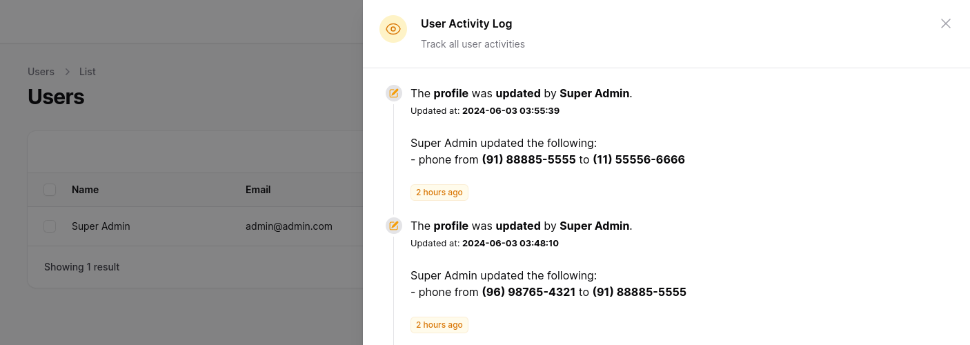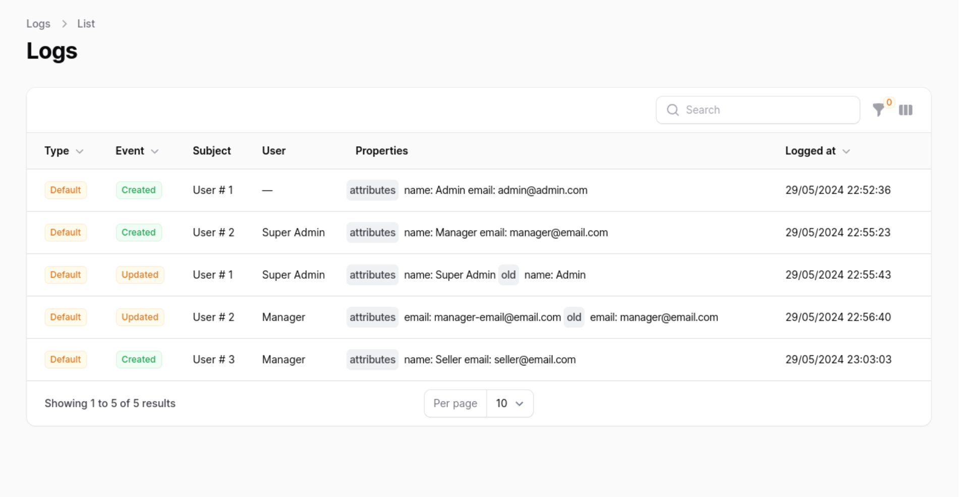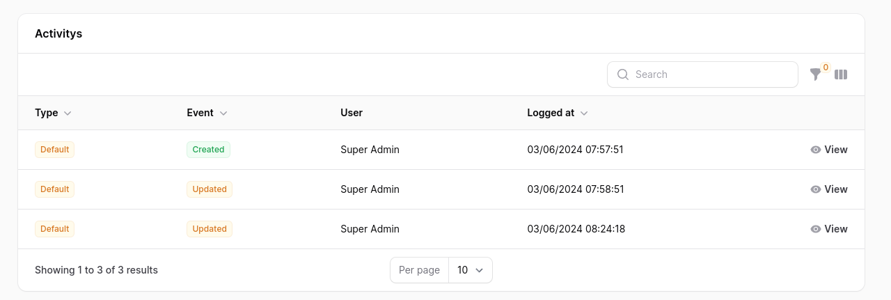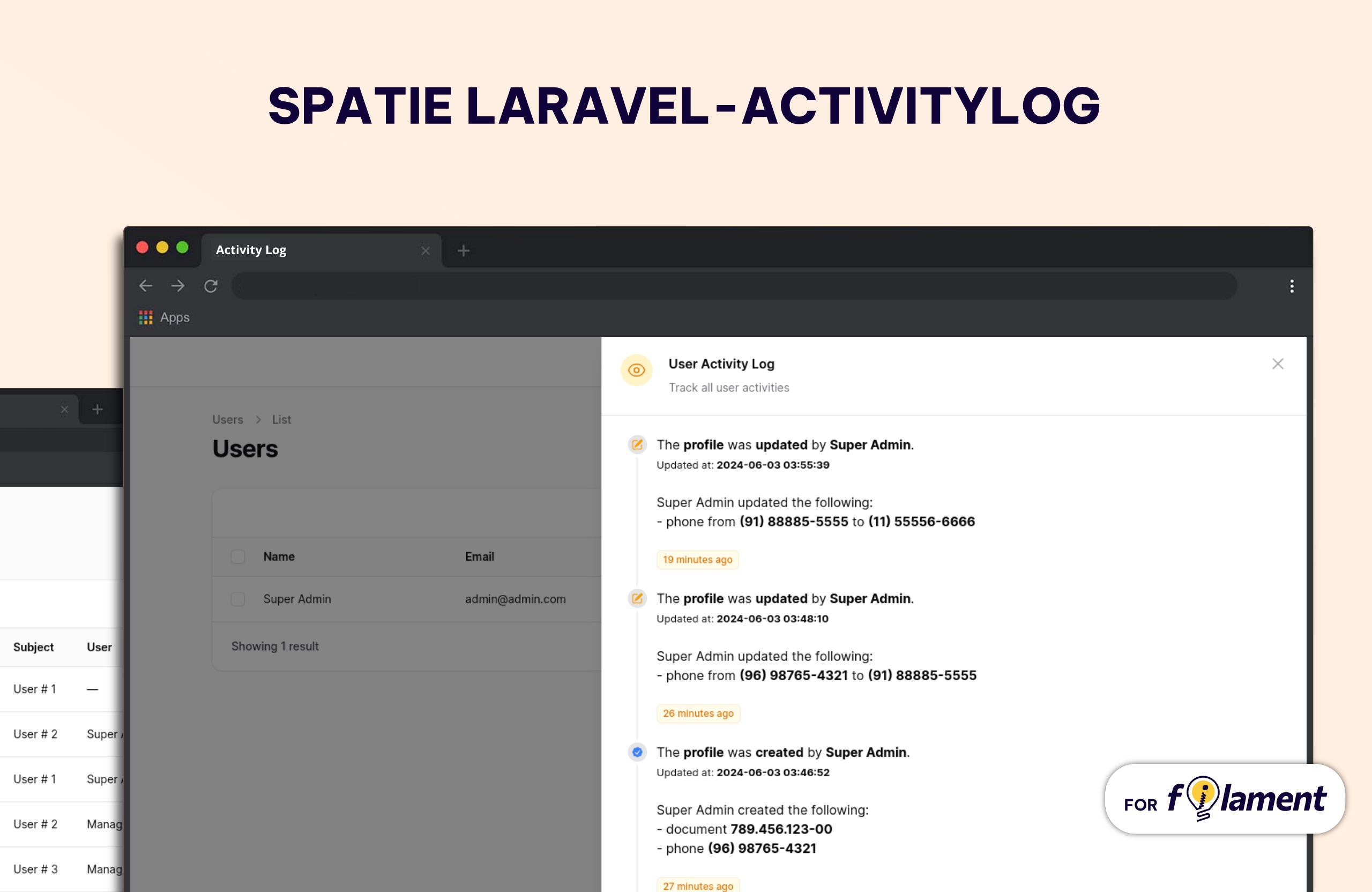 This package provides a Filament resource that shows you all of the activity logs and detailed view of each log created using the spatie/laravel-activitylog package. It also provides a relationship manager for related models.