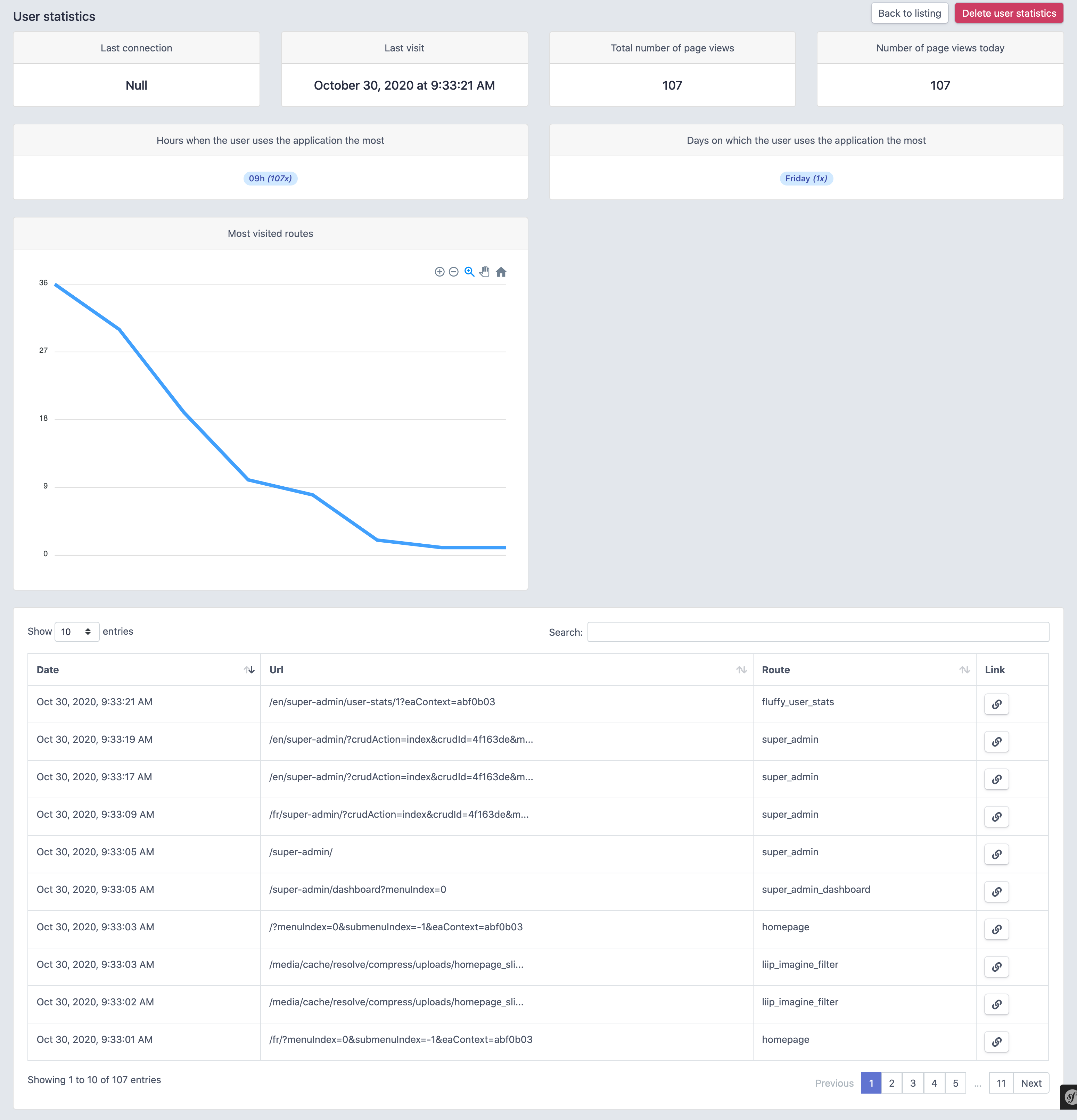 $userStats = Action::new('userStats', 'Statistiques utilisateur') ->linkToRoute('fluffy_user_stats', function (User $entity) { return [ 'id' => $entity->getId() ]; }); return parent::configureActions($actions) ->add(Crud::PAGE_INDEX, $userStats) ->setPermission('userStats', 'ROLE_SUPER_ADMIN');