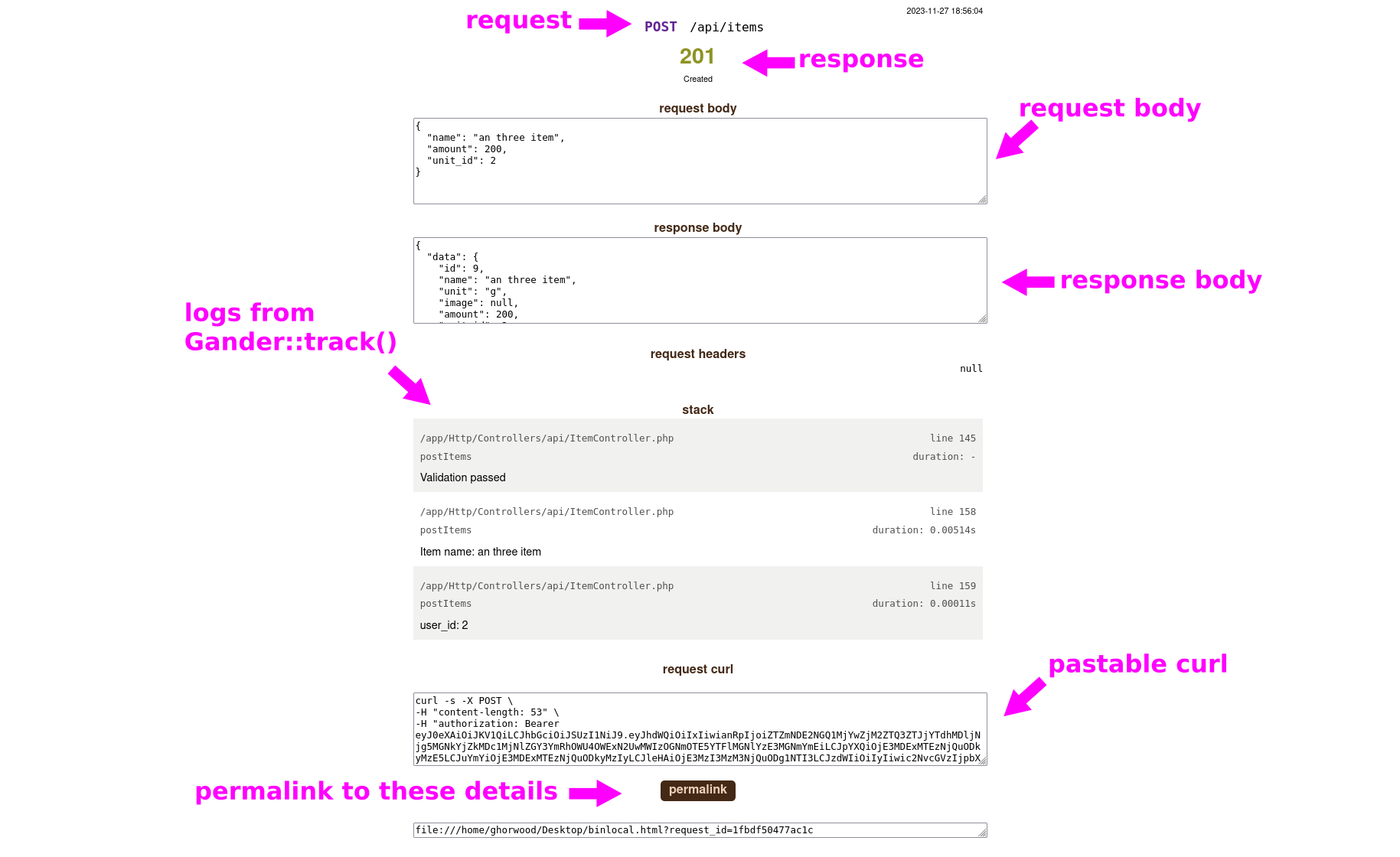 Data logged by Gander can be viewed with a javascript client that runs in your browser. A client can be created by calling the gander artisan command in the root directory of your api.