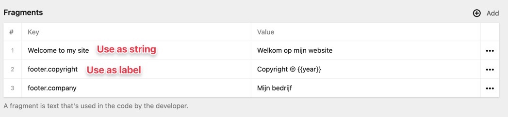 A perfect solution for translation of static labels etc... But can also be used to make other 'static' content manageable via the CMS.