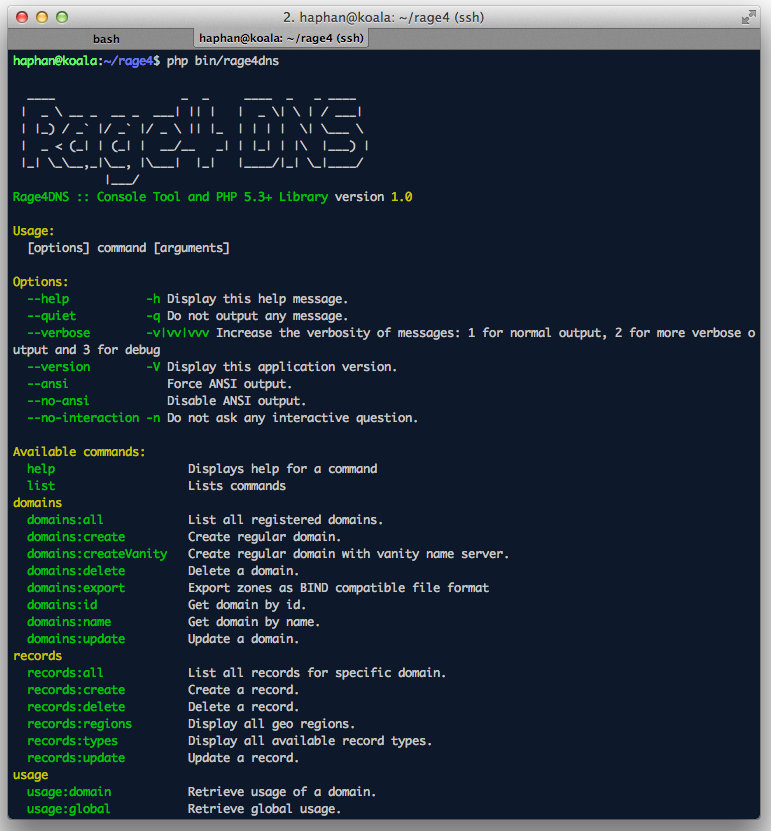 # List all records for specific domain. $ php bin/rage4dns records:all 27995 +--------+------------+------------------------------------------------------------------------+------+------+----------+--------+--------+ | ID | Name | Content | Type | TTL | Priority | Region | Active | +--------+------------+------------------------------------------------------------------------+------+------+----------+--------+--------+ | 600393 | foobar.com | ns1.example.com | NS | 3600 | | 0 | true | | 600395 | foobar.com | ns2.example.com | NS | 3600 | | 0 | true | | 600397 | foobar.com | ns1.example.com newemail.example.com 2014042803 10800 3600 604800 3600 | SOA | 3600 | | 0 | true | +--------+------------+------------------------------------------------------------------------+------+------+----------+--------+--------+ # Create a record. $ php bin/rage4dns records:create records:create 27995 dev.foobar.com 8.8.8.8 2 3600 0 +--------+--------+-------+ | Status | ID | Error | +--------+--------+-------+ | true | 600811 | | +--------+--------+-------+ # Delete a record $ php bin/rage4dns records:delete 600811 Are you sure to delete record with id 600811 ? (y/N) y +--------+--------+-------+ | Status | ID | Error | +--------+--------+-------+ | true | 600811 | | +--------+--------+-------+ # Display all geo regions. $ php bin/rage4dns records:regions +------------------------+--------------+ | Name | Value | +------------------------+--------------+ | World | 0 | | Africa | 2 | | Americas | 4 | | Asia | 8 | | Europe | 16 | | Oceania | 32 | | AustraliaAndNewZealand | 64 | | Caribbean | 132 | | CentralAmerica | 260 | | CentralAsia | 520 | | EasternAfrica | 1026 | | EasternAsia | 2056 | | EasternEurope | 4112 | | Melanesia | 8224 | | Micronesia | 16416 | | MiddleAfrica | 32770 | | NorthernAfrica | 65538 | | NorthernAmerica | 131076 | | NorthernEurope | 262160 | | Polynesia | 524320 | | SouthAmerica | 1048580 | | SouthEasternAsia | 2097160 | | SouthernAfrica | 4194306 | | SouthernAsia | 8388616 | | SouthernEurope | 16777232 | | WesternAfrica | 33554434 | | WesternAsia | 67108872 | | WesternEurope | 134217744 | | USRegion10 | 268566532 | | USRegion1 | 537001988 | | USRegion2 | 1073872900 | | USRegion3 | 2147614724 | | USRegion4 | 4295098372 | | USRegion5 | 8590065668 | | USRegion6 | 17180000260 | | USRegion7 | 34359869444 | | USRegion8 | 68719607812 | | USRegion9 | 137439084548 | | CanadaEast | 274878038020 | | CanadaWest | 549755944964 | | Closest | -1 | +------------------------+--------------+ # Display all available record types. $ php bin/rage4dns records:types +--------+-------+ | Name | Value | +--------+-------+ | SOA | 0 | | NS | 1 | | A | 2 | | AAAA | 3 | | CNAME | 4 | | MX | 5 | | TXT | 6 | | SRV | 7 | | PTR | 8 | | SPF | 9 | | SSHFP | 10 | | LOC | 11 | | NAPTR | 12 | | RRSIG | 13 | | DNSKEY | 14 | | DS | 15 | | NSEC | 16 | | DNAME | 666 | +--------+-------+ # Update a record. $ php bin/rage4dns records:update 600815 dev.foobar.com 8.8.8.8 2 +--------+--------+-------+ | Status | ID | Error | +--------+--------+-------+ | true | 600815 | | +--------+--------+-------+