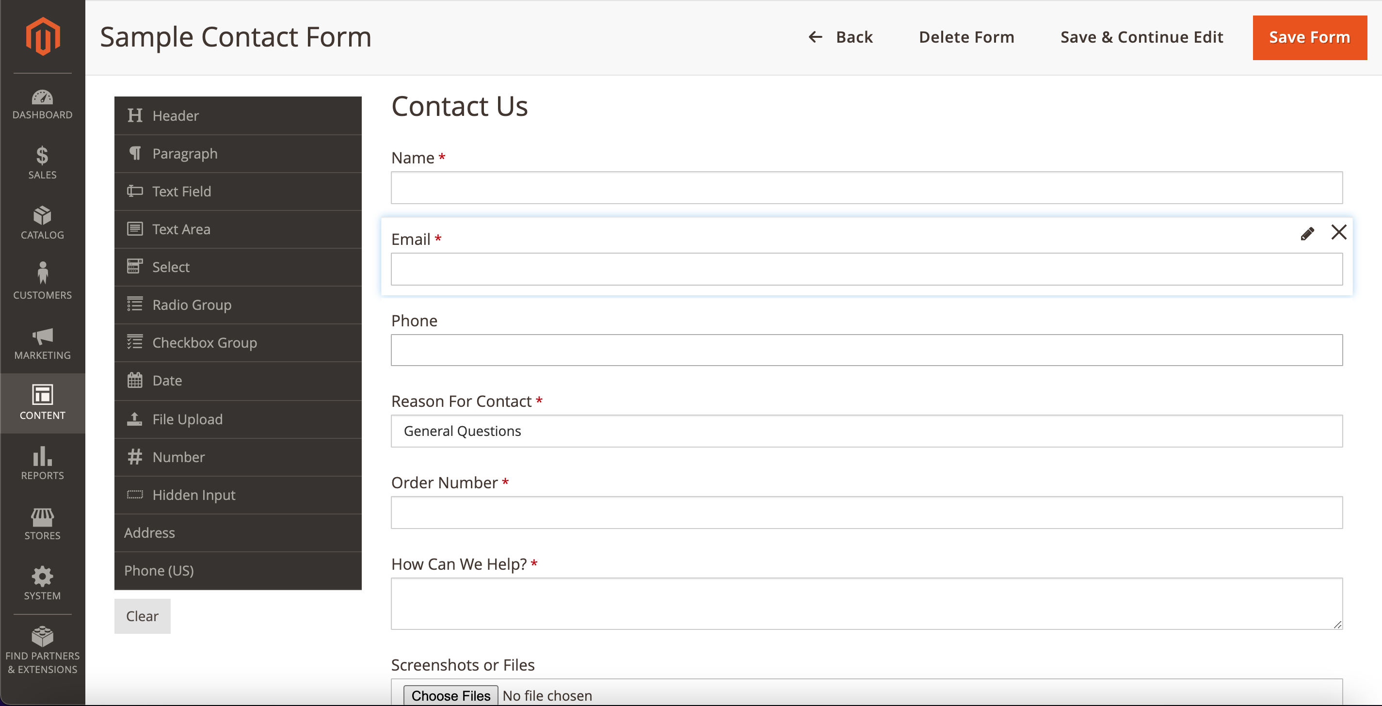 Forms can be created through the admin panel by navigating to Content > Forms > Manage Forms