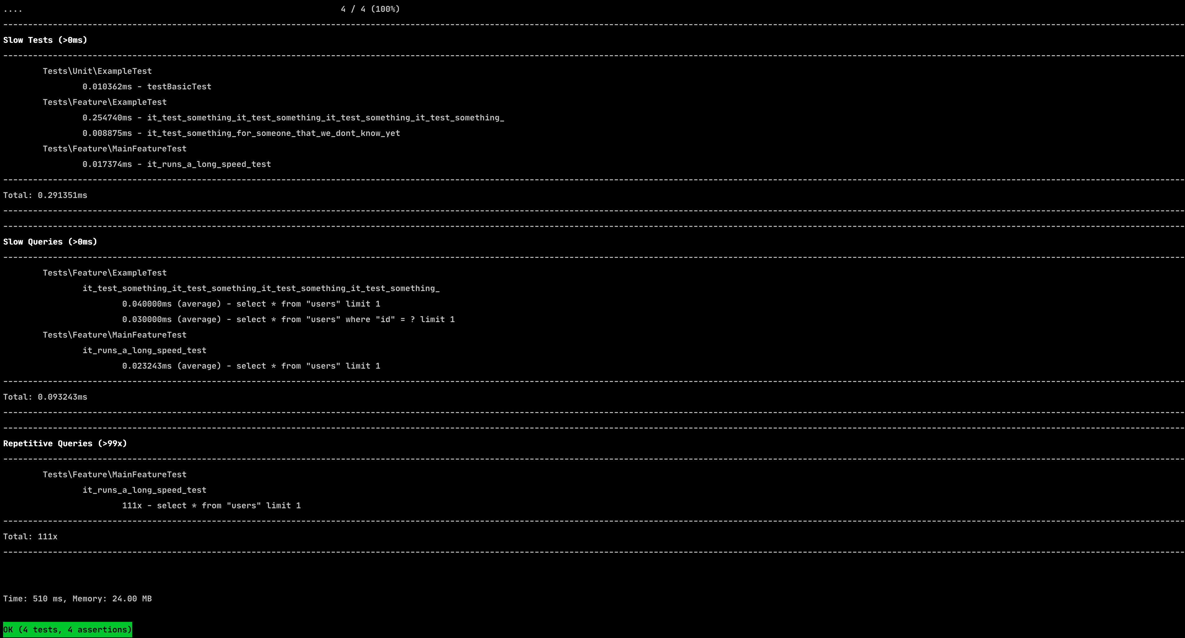 Laravel Test Trap will help you trap any slow tests or when a SQL query is slow or runs multiple times. Laravel Test Trap is inspired by phpunit-speedtrap and is tailored to be used in Laravel applications.