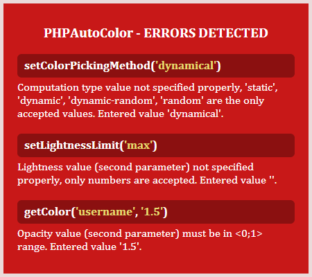 Colors are assigned from pregenerated colors list. The same color will always be assigned to certain input across instances of PHPAutoColor |
