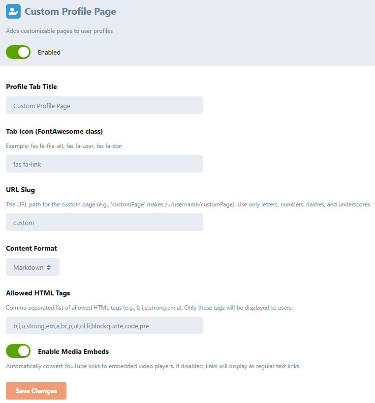 Custom Profile Page allows users to create and customize their own profile pages with rich content. Perfect for portfolios, bios, or any personalized content on your Flarum forum.