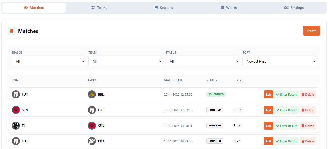 - Status Updates: Matches are automatically marked as "Finished" when results are saved.