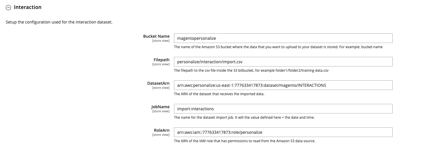 You will need to also setup a S3 bucket that will be responsible to receive the exported data from Magento. It will stored as csv files on S3 and Personalize will read these csv files to import the data. Once you created the S3 bucket you will need to setup the S3 config on Magento admin for each export profile.