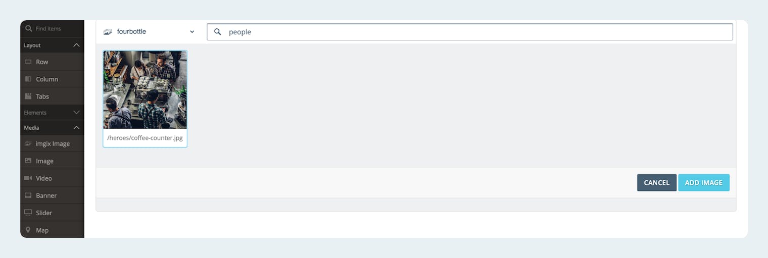From this point, users may follow the same steps as in the Product section to browse, search, and insert an image into this component. Note: in the context of the Page Builder, only one image can be added per component.