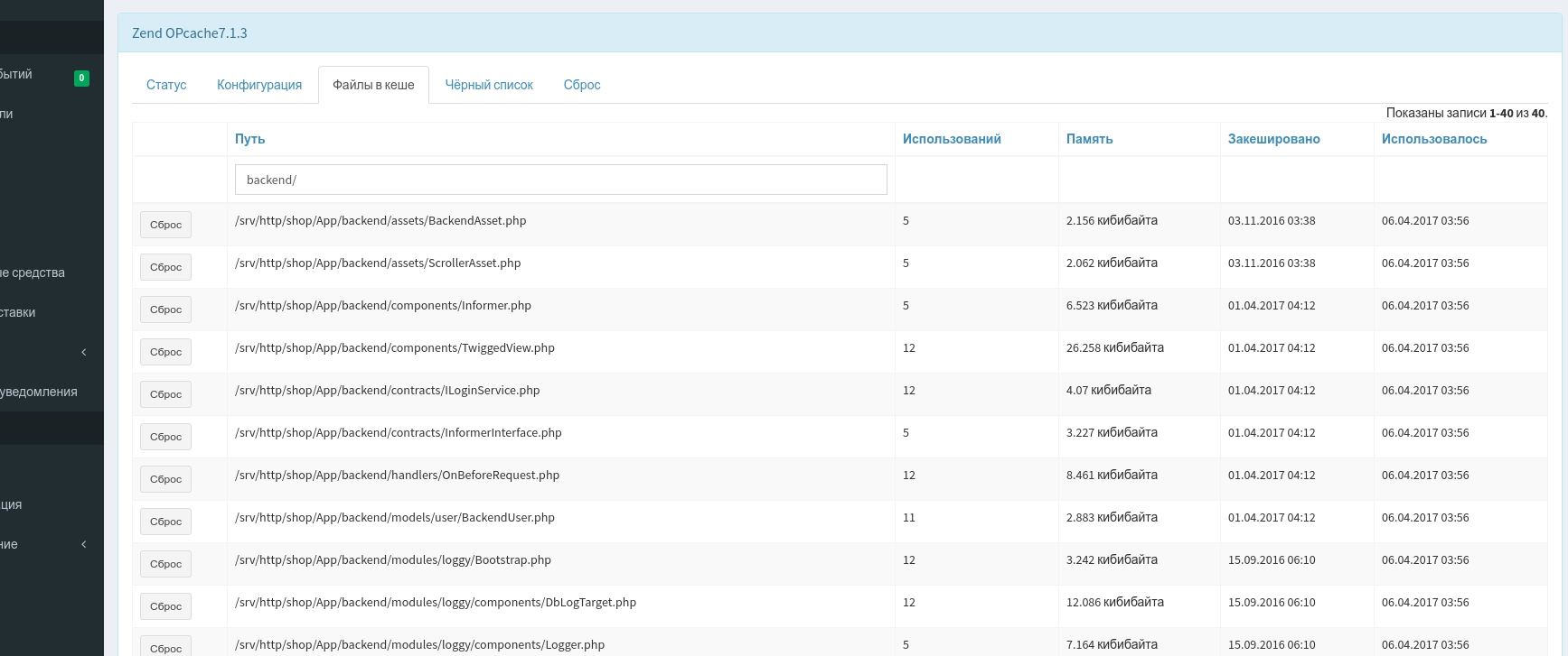 Yii2 OpCache module - Show statistic, config, reset all, invalidate files, search in cached files