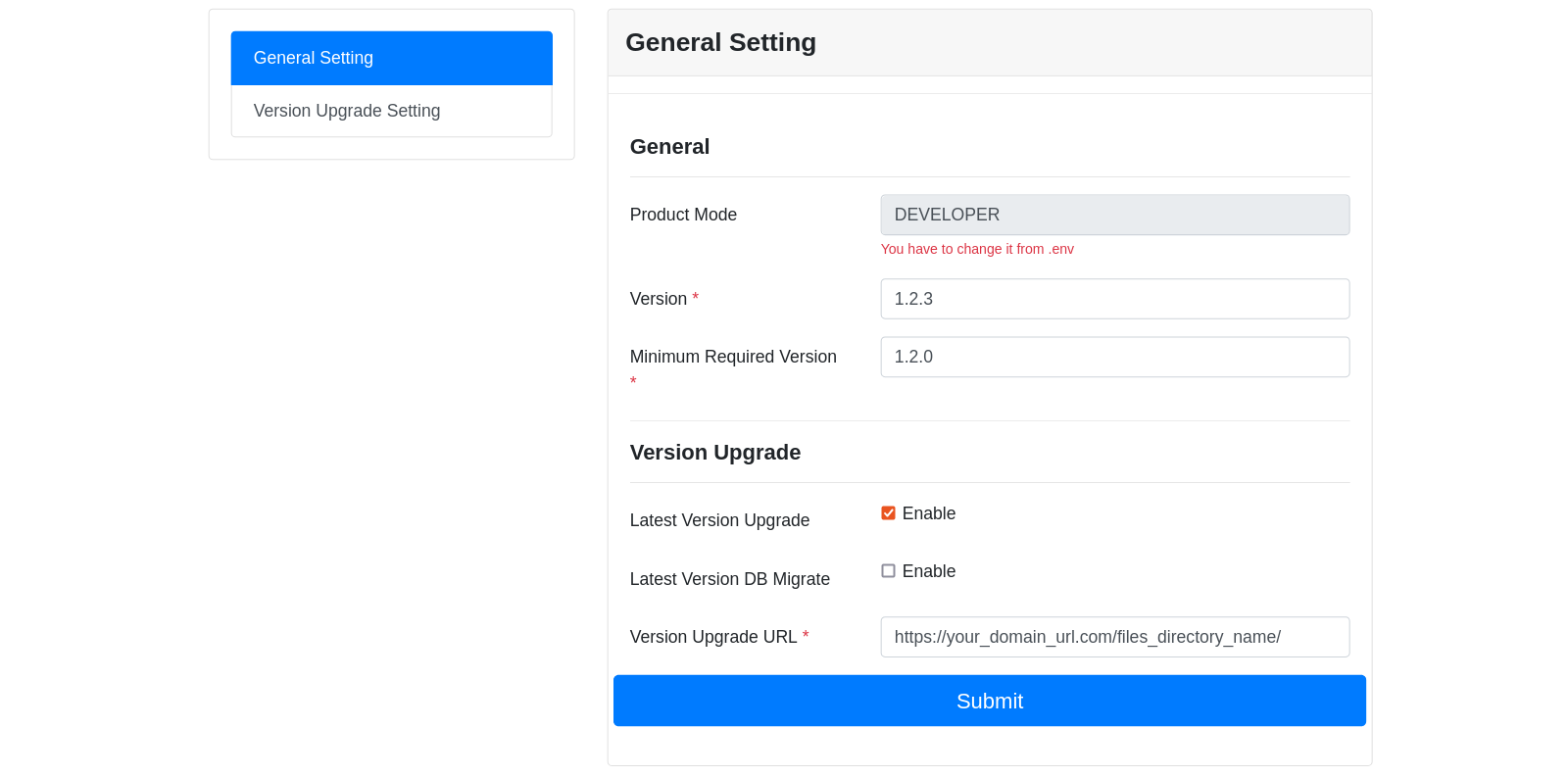 v1.0.0tov5.0.0. In some case old version can not support with latest version feaures. Let if any version isv3.0.0then it will migrate to latest version easily without any hassle. This time it should be minimum required version. - Latest Version Upgrade : You have to enable this when a new version will be released so that old clients get notification and can update.