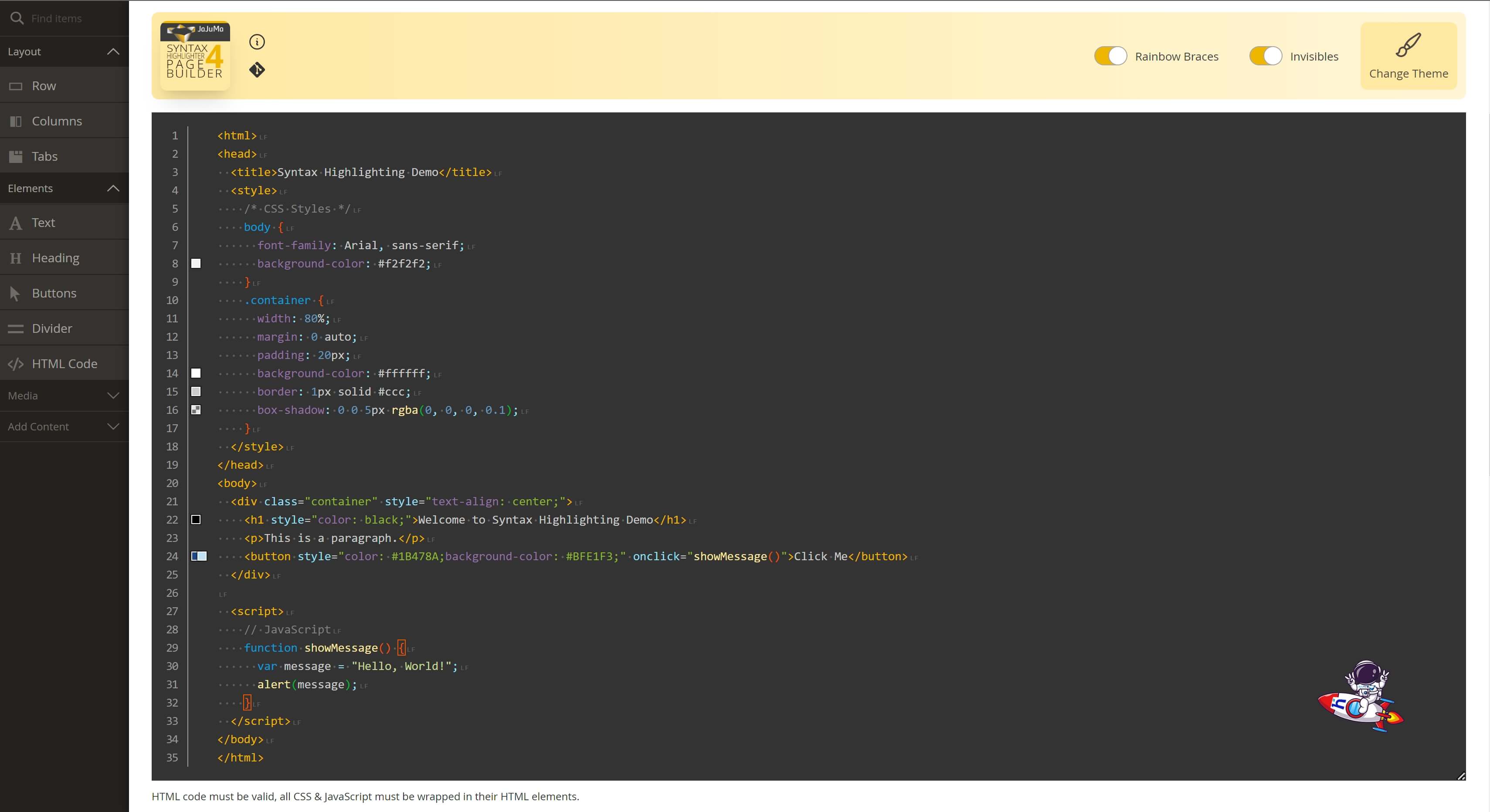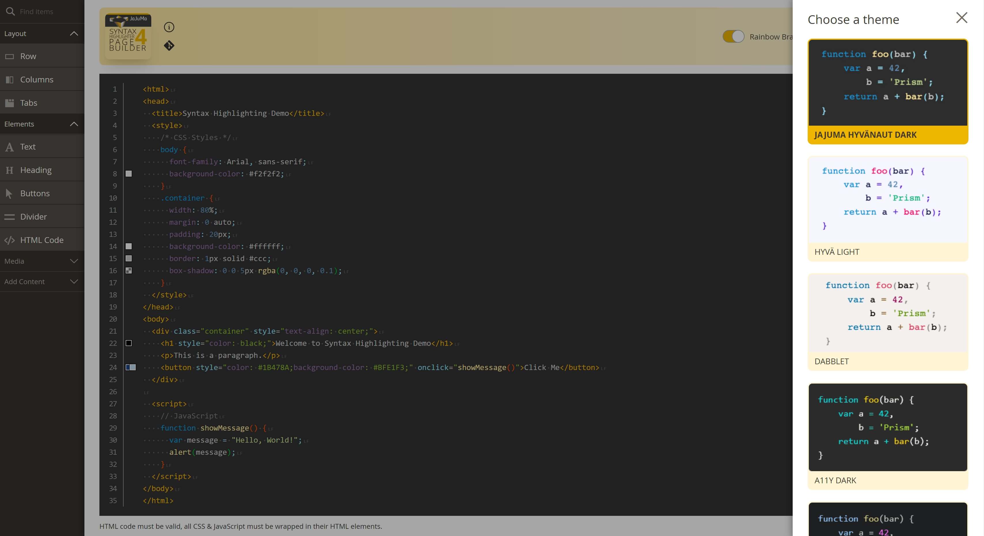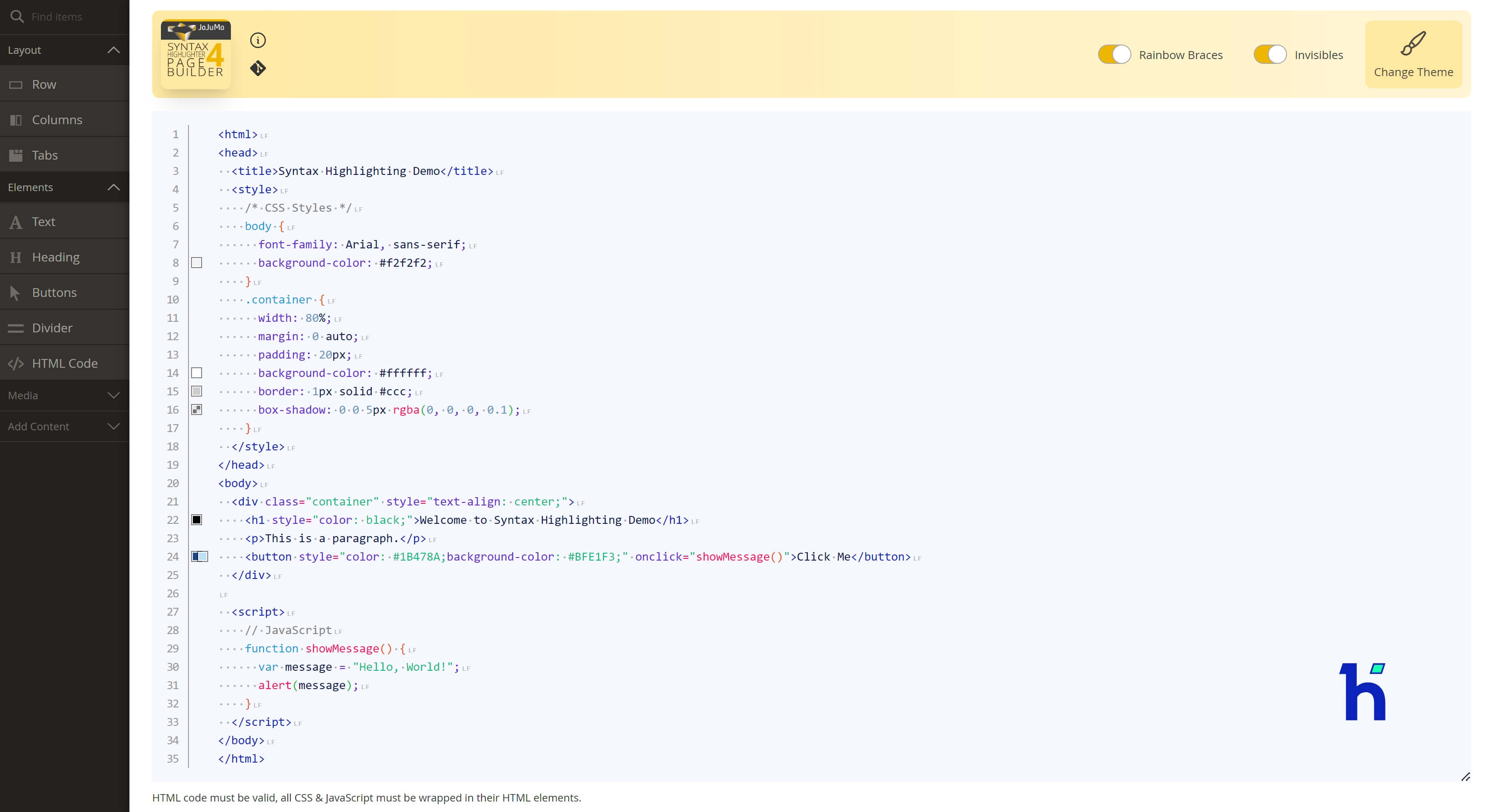 Syntax Highlighter 4 Page Builder by JaJuMa adds syntax highlighting as well as line numbers and color icons for HTML, CSS + Javascript code in Magento 2 Page Builder.