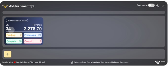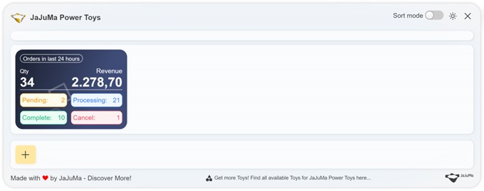 Order Status Power Toy for Magento 2 by JaJuMa is a Dashboard toy displaying quantity of orders, revenue as well as status of orders created within last X hours in your Magento store.