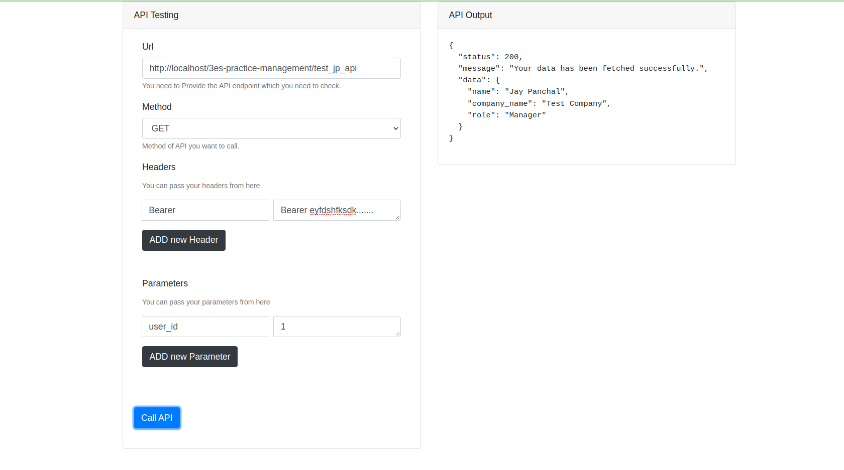 - When you done with your headers and parameters, then you need to click "Call API" button to see your api output in "API Output" box.