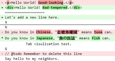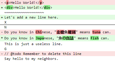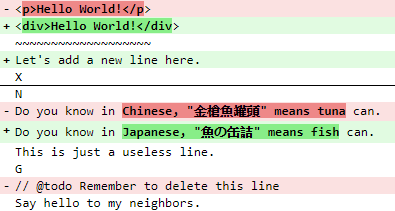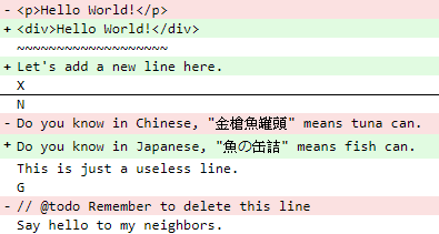*************** *** 1,3 **** ! <p>Hello World!</p> ~~~~~~~~~~~~~~~~~~~ X --- 1,4 ---- ! <div>Hello World!</div> ~~~~~~~~~~~~~~~~~~~ + Let's add a new line here. X *************** *** 7,12 **** N ! Do you know in Chinese, "金槍魚罐頭" means tuna can. This is just a useless line. G - // remember to delete this line Say hello to my neighbors. --- 8,12 ---- N ! Do you know in Japanese, "魚の缶詰" means fish can. This is just a useless line. G Say hello to my neighbors.