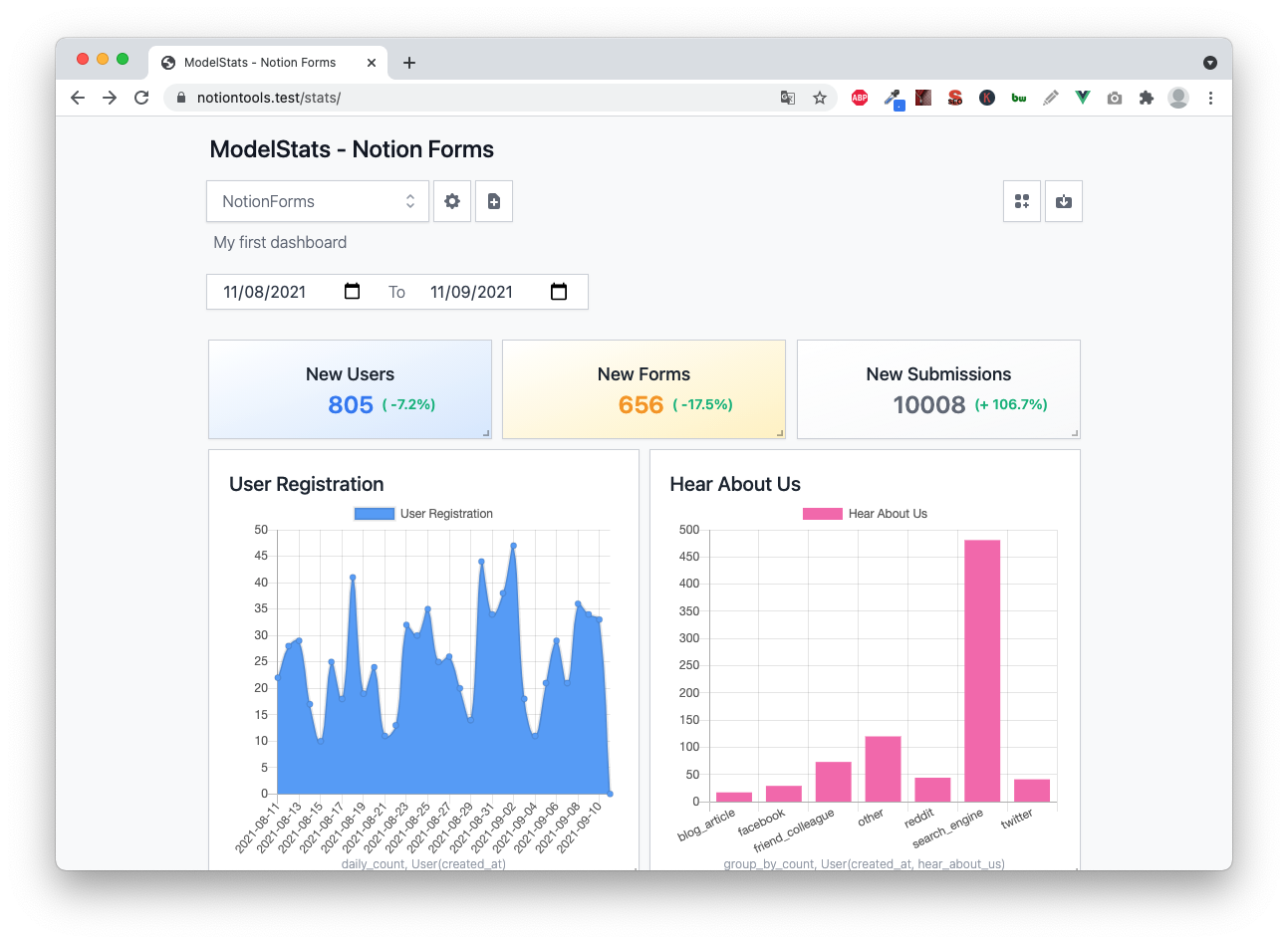 This Laravel packages gives you a statistic dashboard for you Laravel application. Think of it as a light version of Grafana, but built-in your Laravel application, and much easier to get started with. No code knowledge is required to use Laravel Model Stats, users can do everything from the web interface. It also optionally supports custom-code widgets, allowing you to define your widget data with code, just like you would do with tinker.