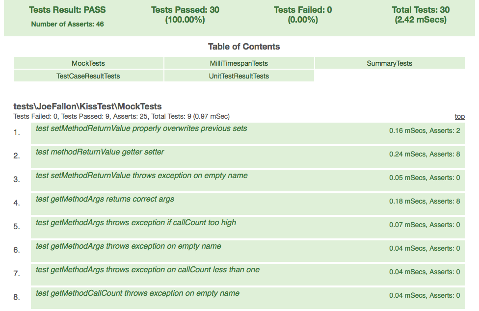 - The results of all the tests are displayed in a table of contents format. If a test failed, it will be red. Click on it and go right to the results for the failing test. Then, click the handy "top" link and go right back to the table of contents. Better yet, fix the test, press F5 and see the test go green.