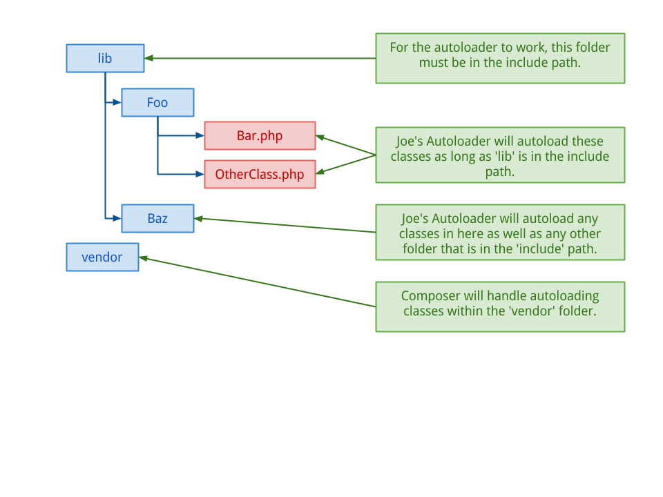- When auto-loading a class, all of the include paths are searched automatically.